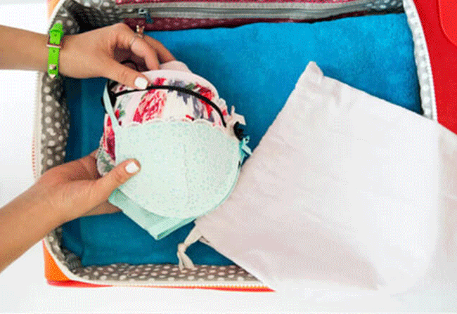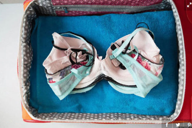 7. Giúp áo ngực giữ được phom dáng nhưng vẫn tiết kiệm không gian trong vali bằng cách xếp áo ngực chồng lên nhau, và gấp đôi chúng lại, sau đó nhét quần lót vào khoảng không ở giữa. Nhồi quần lót bên trong áo ngực sẽ giúp phần cúp ngực căng lên, không bị ép vào bên trong và giữ được phom dáng.