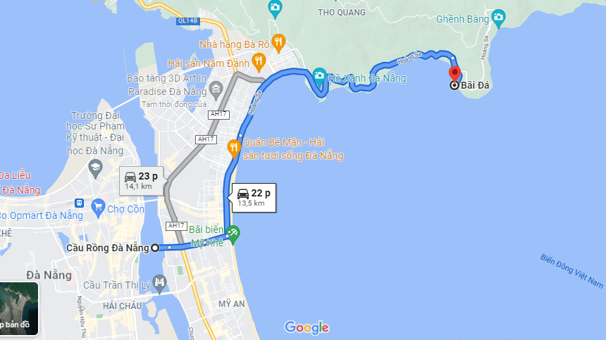 Bắt đầu từ cầu Rồng, bạn di chuyển theo hướng biển Mỹ Khê. Sau khi qua cầu, tiếp tục đi thẳng theo đường Võ Văn Kiệt. Khi đến vòng xoay, bạn rẽ trái vào đường Võ Nguyên Giáp, sau đó tiếp tục đi thẳng đến đường Hoàng Sa. Đi thẳng thêm một chút, bạn sẽ đến được bãi đá Obama, còn được gọi là bãi Đa Sơn Trà.