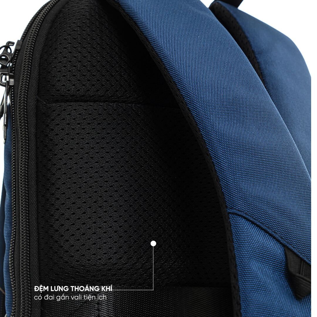 Được trang bị đệm lưng êm ái, thoáng khí, balo giúp giảm áp lực lên vai khi mang trong thời gian dài. Ngoài ra, đai gắn vali tiện dụng giúp bạn dễ dàng cố định balo lên vali kéo khi di chuyển.