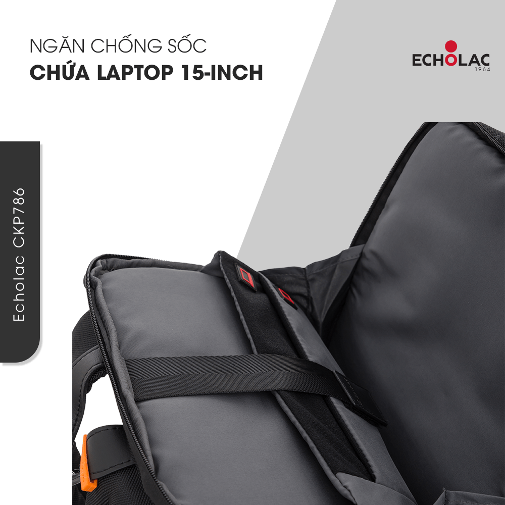 Balo laptop Echolac CKP786 có thiết kế tối ưu sự tiện lợi cho người dùng với nhiều ngăn chứa phân loại nhiều đồ dùng khác nhau, cụ thể gồm 2 ngăn chính với 3 ngăn phụ ẩn bên trong ngăn chính và 4 ngăn phụ bên ngoài balo. Ngăn chống sốc được tích hợp bên trong ngăn chính với sức chứa tối ưu, có thể chứa được laptop đến 15 inch.