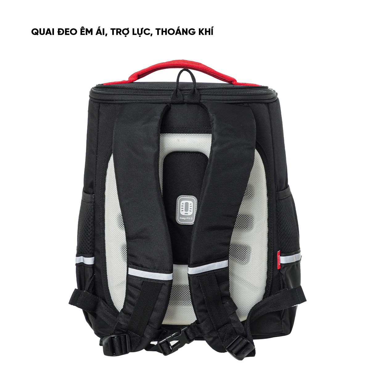 Balo được trang bị quai đeo bản to với lớp đệm êm ái, giúp phân tán đều trọng lượng khi đeo, giảm áp lực lên vai và cột sống của bé. Phần lưng balo thiết kế thoáng khí, hạn chế tích tụ mồ hôi, giúp bé luôn thoải mái khi mang balo suốt ngày dài.