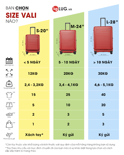Hiện tại có 3 kích thước thông dụng là 20’’, 24’’ và 28’’. Trong đó kích thước hành lý xách tay thuộc nhóm từ 20’’ trở xuống (18’’,16’’..) và hành lý ký gửi từ 22’’ trở lên (24’’,26’’,28’’,30’’..)