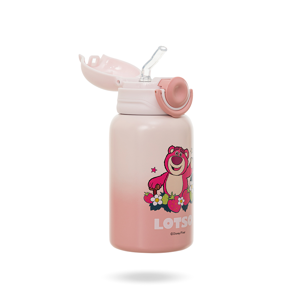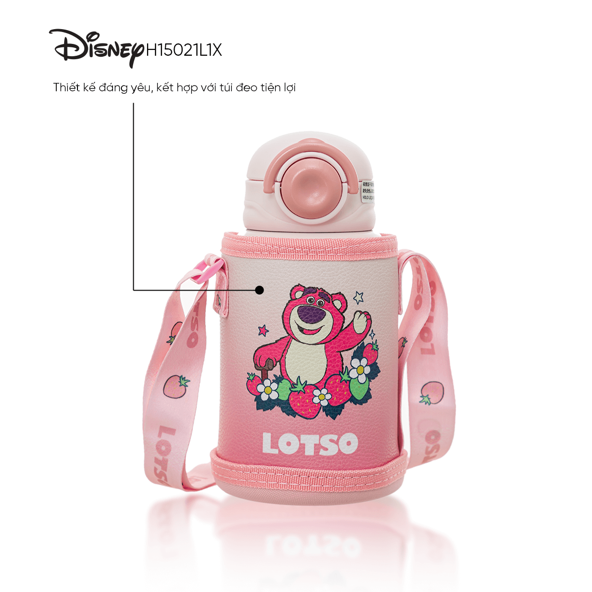 Bình được trang trí họa tiết nhân vật Lotso rực rỡ dễ thương, đi kèm dây đeo vai thoải mái, phù hợp để mang theo đi học, đi chơi hay dã ngoại. Bao vải bảo vệ giúp bình chống trầy xước, đồng thời giữ cho bình luôn sạch sẽ và bền đẹp dễ mang theo.