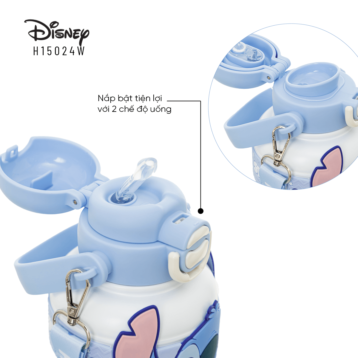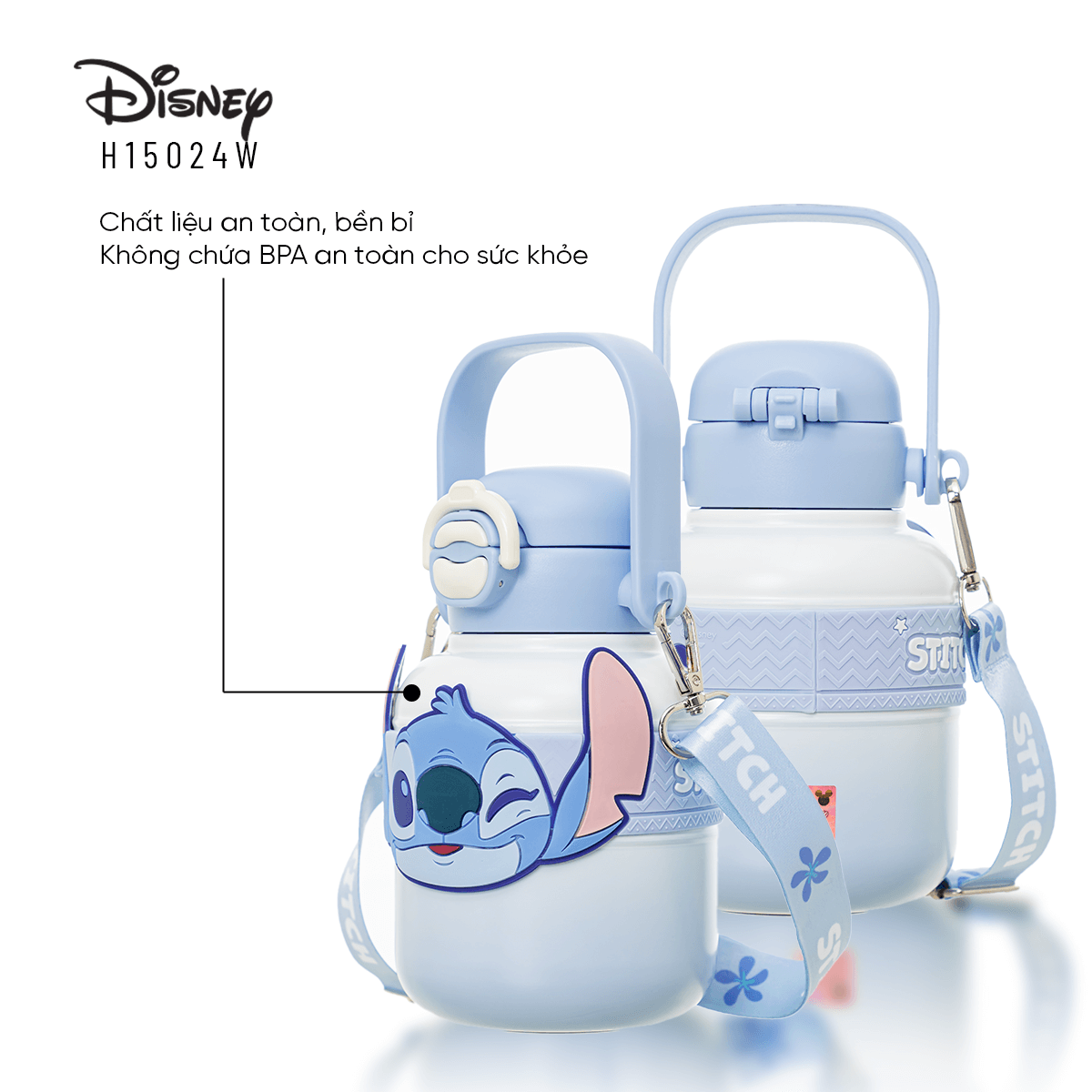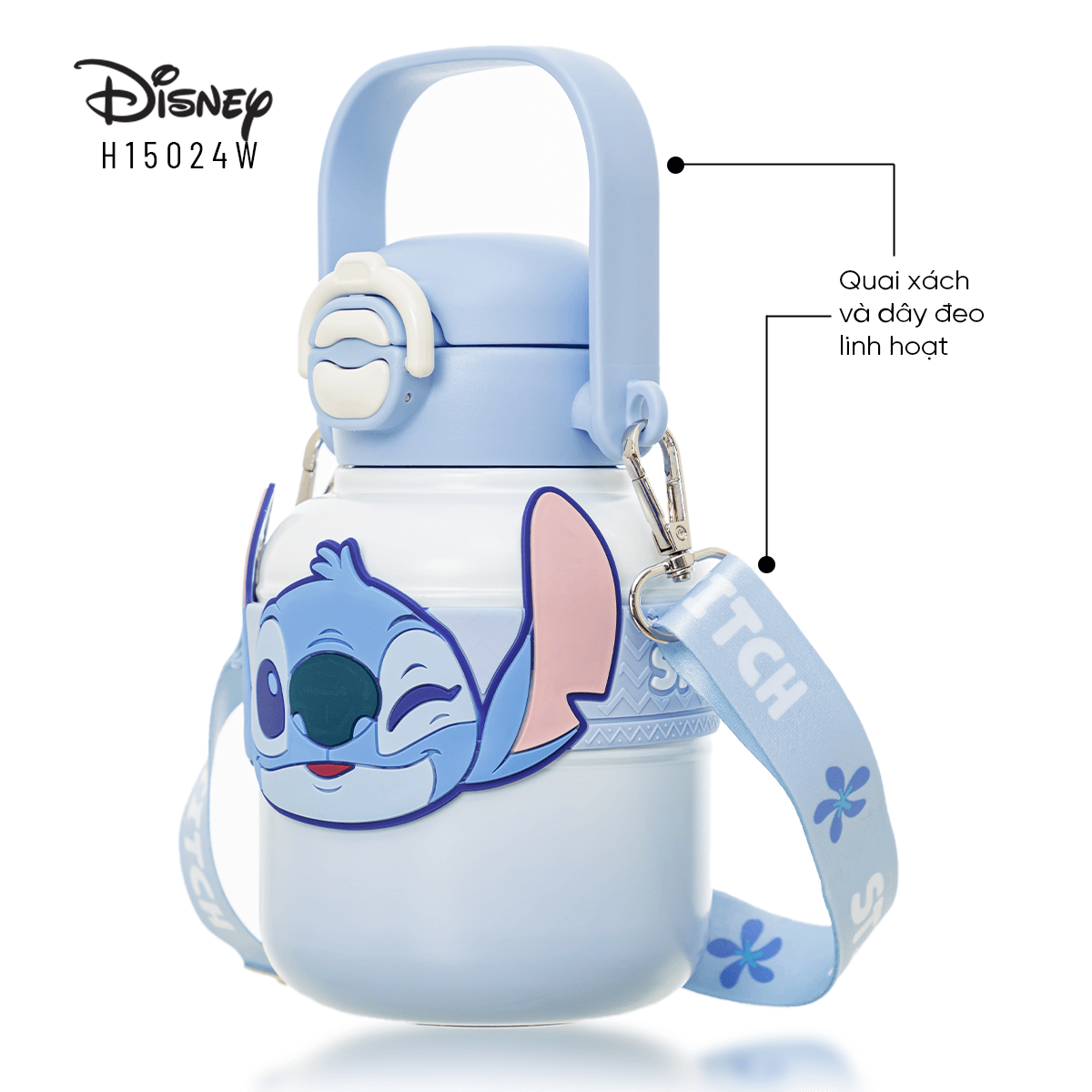 Bình nước Disney H15024W nổi bật với hình ảnh Stitch đáng yêu, tạo điểm nhấn bắt mắt và thu hút. Đây không chỉ là bình nước cho các bé nhỏ, học sinh mà còn có thể trở thành món phụ kiện lý tưởng cho những bạn yêu thích những sản phẩm dễ thương.