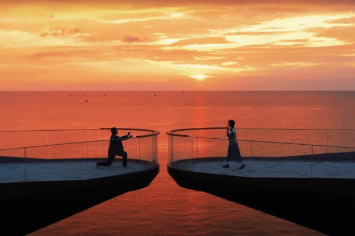 Cầu Hôn là công trình biểu tượng mới của Phú Quốc, nhanh chóng trở thành điểm checkin “hot” trên mạng xã hội. Thiết kế độc đáo với hai nhánh cầu không chạm vào nhau, tạo nên khoảng hở tinh tế giữa biển trời, mang ý nghĩa gắn kết và lãng mạn. Khi ánh hoàng hôn chiếu qua khoảng trống ở trung tâm cầu, khung cảnh trở nên vô cùng ấn tượng, phù hợp cho những bức ảnh mang màu sắc nghệ thuật hoặc ảnh couple. Đây là địa điểm được nhiều du khách đánh giá là một trong những background chụp ảnh đẹp nhất tại Phú Quốc hiện nay.