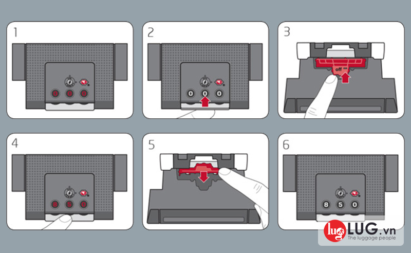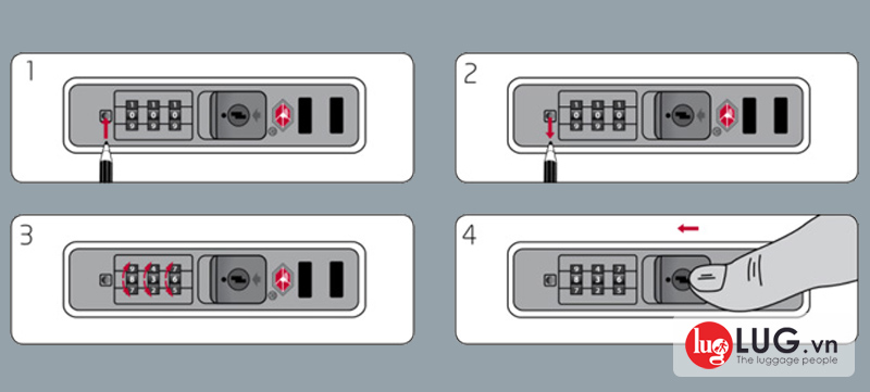 Bước 4: Hoàn thành thao tác cài mật khẩu bằng cách nhấn vào nút mở khóa vali (ở phía trên hoặc bên hông từng loại khóa).