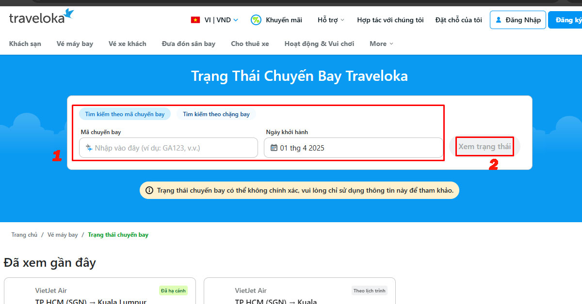- Traveloka: Truy cập “https://www.traveloka.com/vi-vn/flight/flight-status”, đăng nhập tài khoản. Tiếp theo, điền thông tin tìm kiếm theo mã chuyến bay và chặng bay, sau đó chọn “Xem trạng thái”, lập tức bạn sẽ nhận được kết quả.
