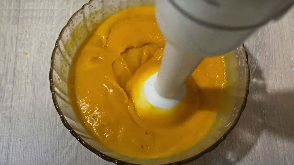 Bước 2: Xay nhuyễn bí đỏ vừa hấp chín với 50ml sữa tươi. Bạn có thể dùng cách nghiền nhuyễn bí đỏ thay cho việc bỏ vào máy xay nếu không có thiết bị, sau đó cho sữa vào và lọc qua ray.