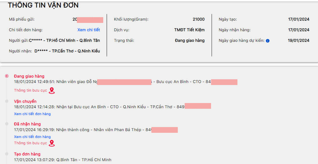 Tại giao diện thông tin vận đơn sau khi hoàn thành việc tra cứu, khách hàng sẽ biết được đơn hàng của mình đang ở trạng thái nào. Trong đó: