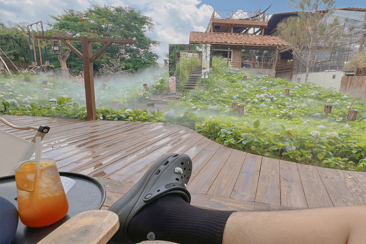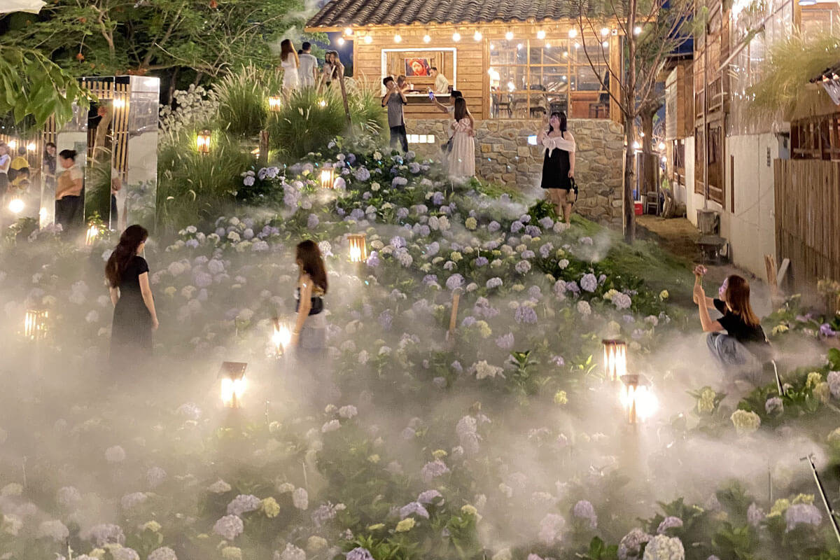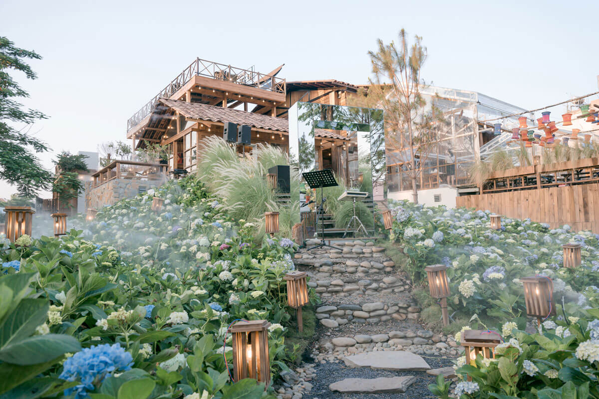 Hiện tại, Ngôi Làng Trên Mây được biết đến là quán cafe có nhiều view đẹp. Tuy nhiên, không gian cụ thể như thế nào thì không phải ai cũng biết. Quán chủ yếu decor theo kiểu một ngôi vườn cổ tích với ngôi nhà bằng gỗ và có nhiều cây cối cùng hoa đẹp bao quanh. Nổi bật nhất chính là vườn hoa cẩm tú cầu màu trắng sữa và xanh bích vô cùng thơ mộng. Đến với cafe Ngôi Làng Trên Mây, các nàng có thể hóa thân thành nàng thơ để chụp ảnh với vườn hoa xinh đẹp.