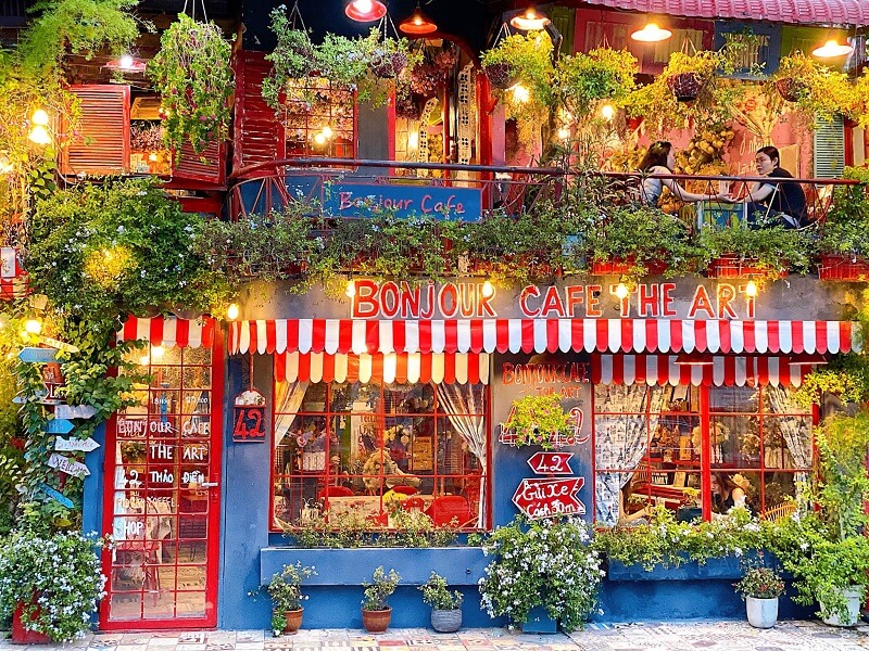 Bonjour Cafe the Art là một trong những điểm đến lý tưởng cho những ai yêu thích thú vui thưởng thức cafe sáng Sài Gòn. Quán nổi bật với sắc đỏ truyền thống và sự tinh tế lấy cảm hứng từ những con phố tại Paris. Khác biệt hoàn toàn so với sự hối hả của thành phố, tại đây bạn sẽ được thả lỏng trong âm nhạc của nước Pháp nhẹ nhàng và ngắm nhìn những bông hồng đỏ tươi sáng. Dù sử dụng phong cách phối màu color block nhưng không gian của Bonjour Cafe the Art lại không hề gây ra cảm giác rối mắt. Ngược lại, nó tạo ra một cảm giác thoải mái, thư thái và hấp dẫn mà khó lòng cưỡng lại được.