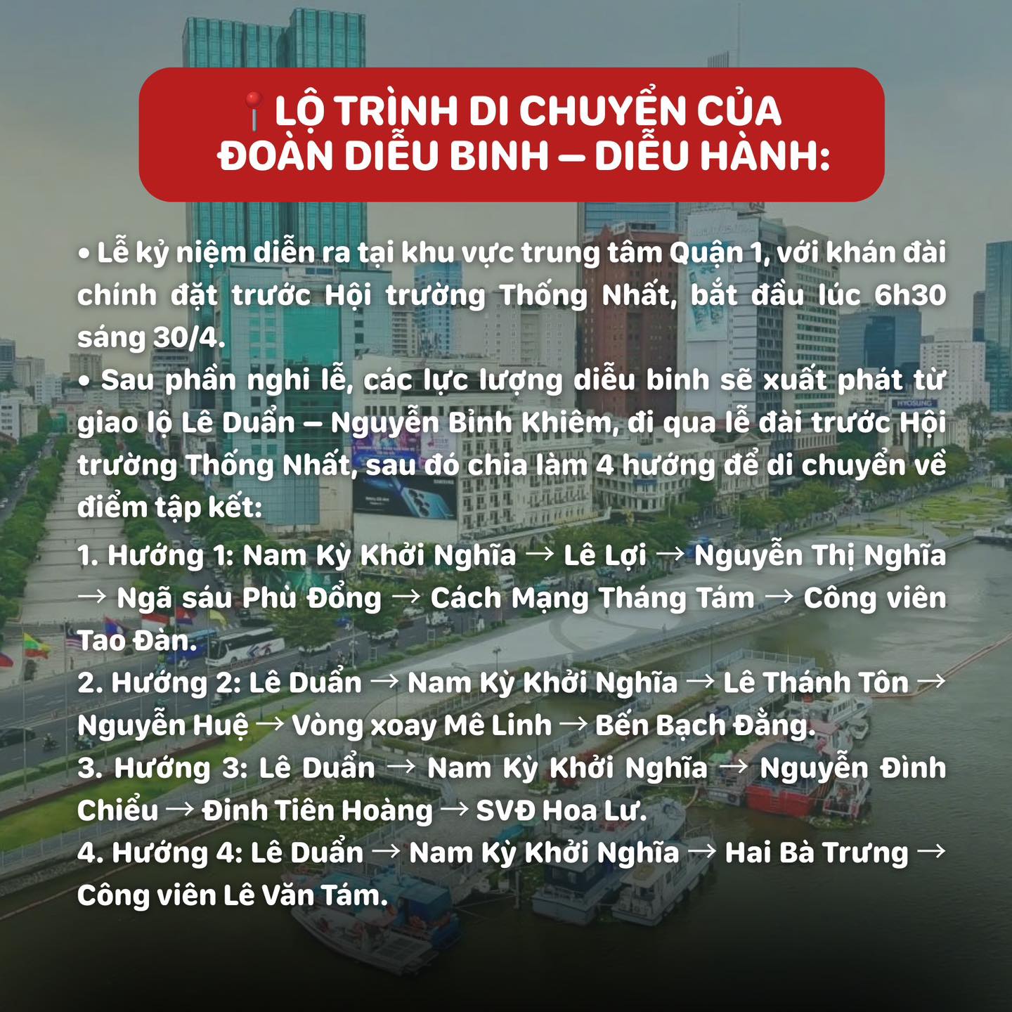 Sau phần nghi lễ trọng thể trước lễ đài chính, các lực lượng diễu binh sẽ xuất phát từ trục đường Lê Duẩn – Nguyễn Bỉnh Khiêm, tiến qua lễ đài trước Hội trường Thống Nhất. Tại đây, các đơn vị sẽ thực hiện nghi thức chào mừng, sau đó tiếp tục di chuyển theo 4 hướng chính để về các điểm tập kết khác nhau.