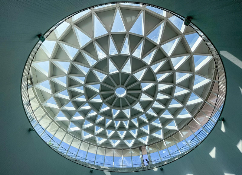 Điểm nhấn đặc biệt của nhà ga chính là giếng trời khổng lồ với thiết kế hình hoa sen độc đáo. Không chỉ mang đến nguồn ánh sáng tự nhiên cho toàn bộ không gian, giếng trời này còn là "ngôi sao" của mọi bức ảnh. Từ góc nhìn từ dưới lên, những cánh sen bằng kính cường lực phản chiếu ánh sáng tạo nên hiệu ứng lung linh, đến góc chụp toàn cảnh bao quát toàn bộ nhà ga, bạn sẽ cảm nhận rõ nét vẻ đẹp hiện đại và tinh tế.