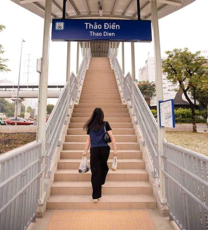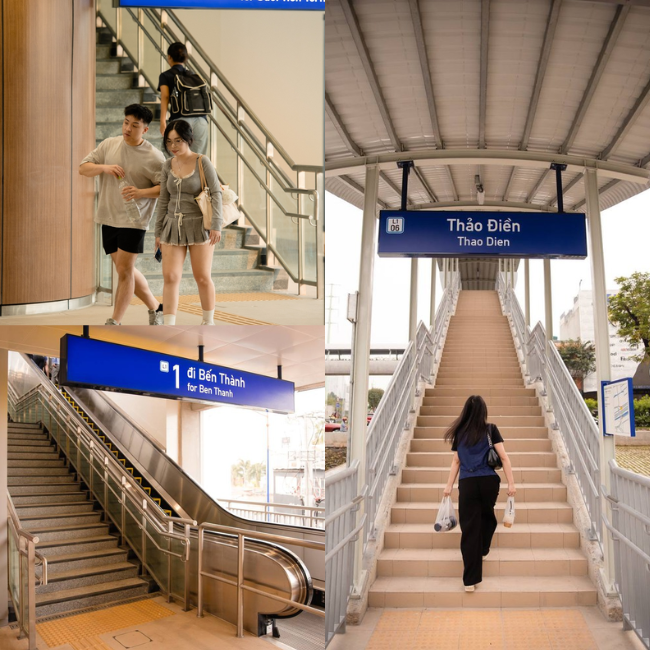 Cầu thang bộ và thang cuốn tại nhà ga là nơi bạn có thể thỏa sức sáng tạo. Với thiết kế hiện đại, không gian thoáng đãng, khu vực này gợi cảm giác như một sàn diễn thời trang. Hãy thử bước đi nhẹ nhàng, phối hợp với góc chụp từ trên cao xuống hoặc từ dưới lên, bạn sẽ có ngay những bức ảnh vừa cá tính vừa đầy nghệ thuật.