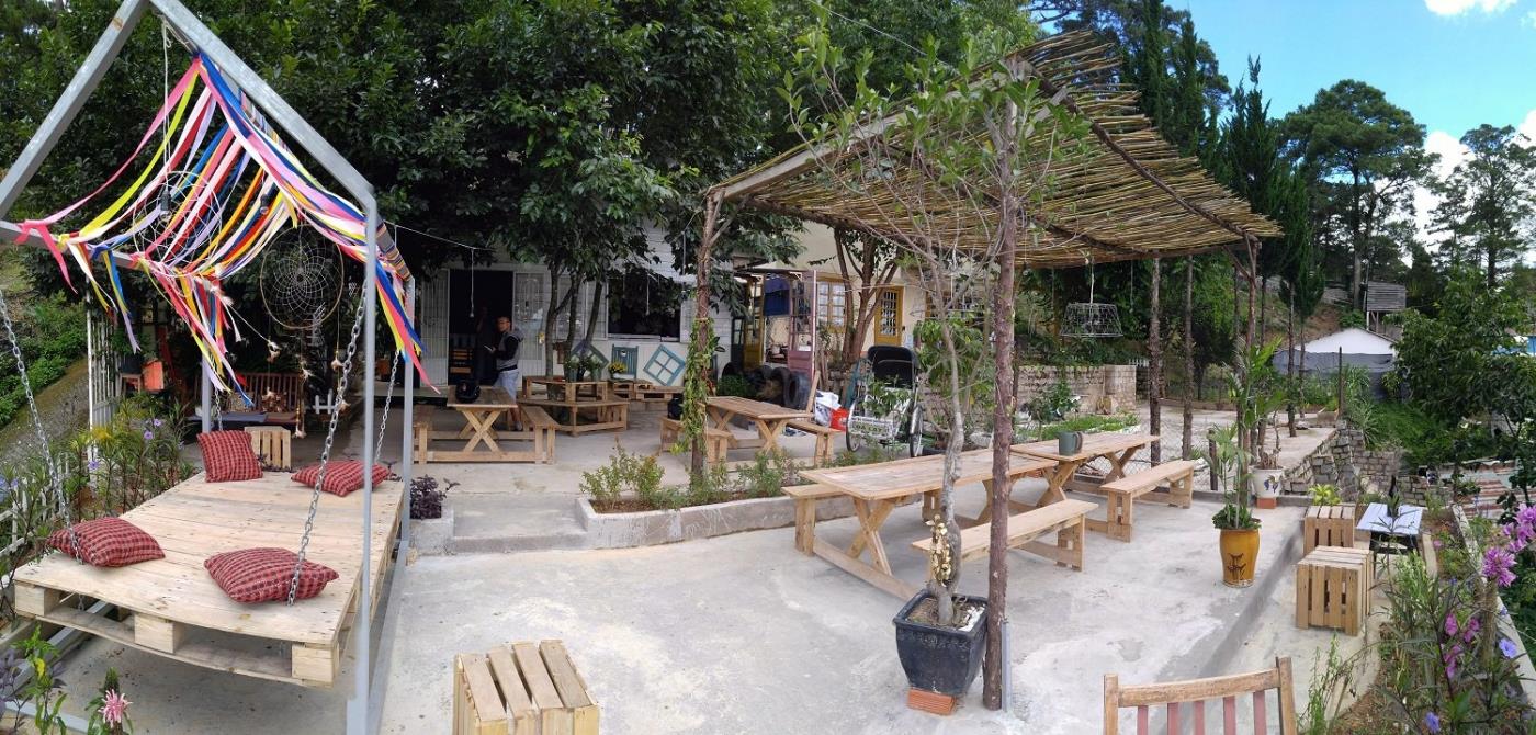 Ngay từ lối vào, bạn sẽ ấn tượng với con đường dốc nhỏ dẫn xuống quán, hai bên là hàng cây xanh rì cùng những bậc thang gỗ xếp ngay ngắn, tạo nên khung cảnh lãng mạn, đậm chất Đà Lạt.
