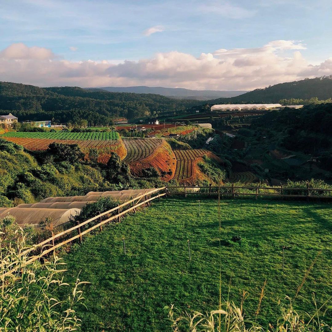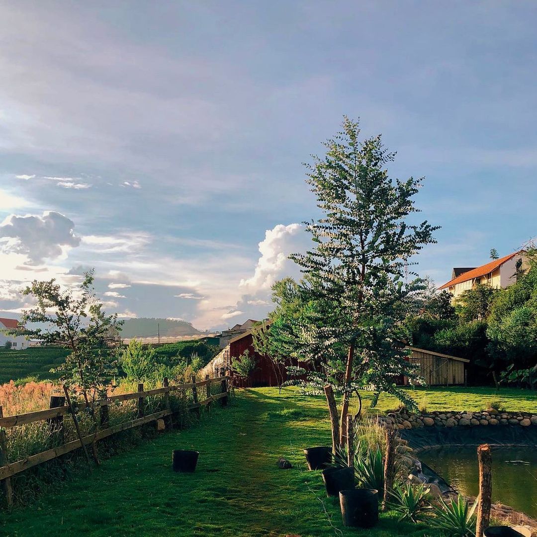 Ngoài những tiểu cảnh được thiết kế tỉ mỉ, nông trại còn sở hữu background thiên nhiên “đắt giá” với vườn hoa ngũ sắc, mimosa vàng rực và đồng cỏ xanh mướt trải dài. Chẳng cần filter, chỉ cần nắng Đà Lạt và một chút cảm hứng là bạn đã có cả album ảnh triệu like mang về.