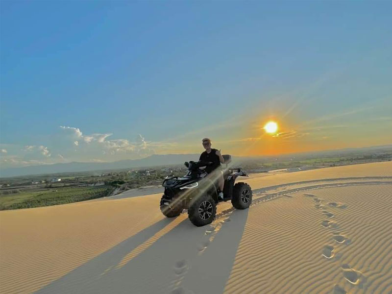 Với 1 lần thuê xe địa hình tại đồi cát Quang Phú, du khách sẽ được người lái chuyên nghiệp chở lượn một vòng cồn cát từ chân đồi lên đỉnh đồi. Với bề mặt cát không bằng phẳng, nhiều dốc cao kết hợp cùng tốc độ chạy nhanh của xe địa hình, bạn chắc chắn sẽ có trải nghiệm với những pha cua đầy “thót tim”. Tuy nhiên, hãy an tâm vì nó khá an toàn và đây thật sự là một trải nghiệm thú vị khi được ngắm cảnh với cảm giác mạnh.