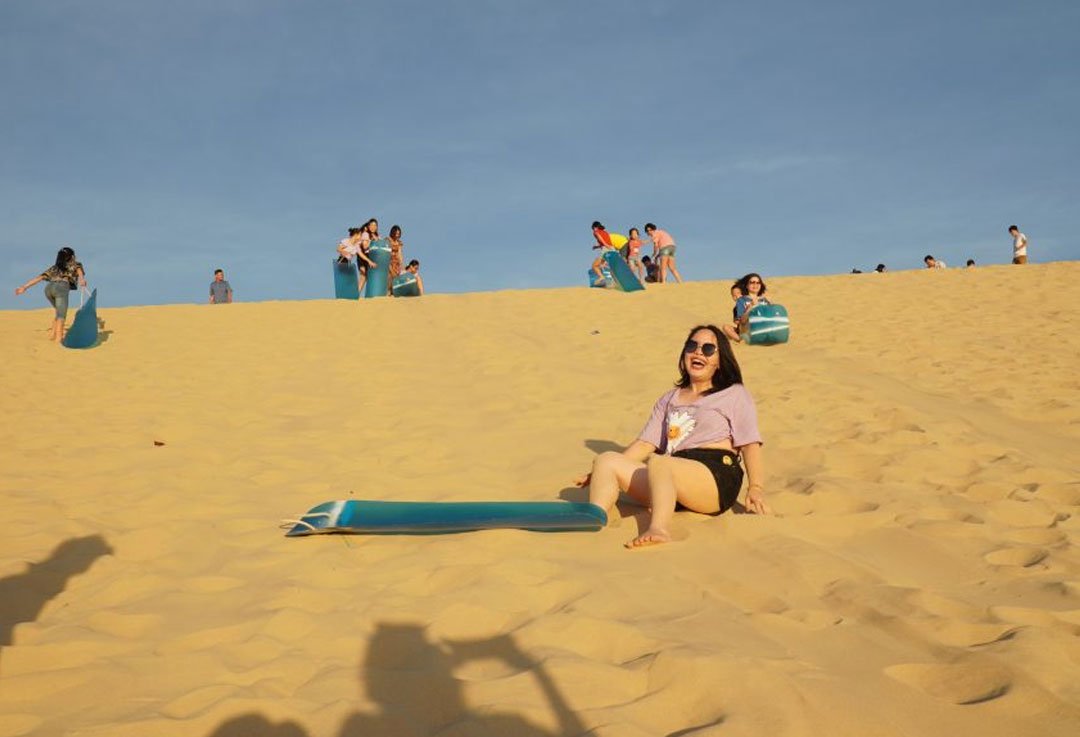 Trượt cát từ dốc cao bằng ván là một cảm giác thật sự khá thú vị khi du khách đến với cồn cát Quang Phú. Trải nghiệm này phù hợp với cả người lớn và trẻ em, bởi độ nguy hiểm của nó khá thấp. Cảm giác được nằm thả tự do trên mặt cát đầy dốc chắc chắn sẽ cho bạn những giây phút hào hứng và khó quên.