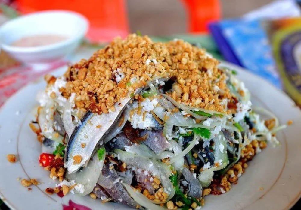 Gỏi cá trích trứ danh là một biểu tượng của đặc sản Kiên Giang, mang hương vị biển cả thuần túy. Những con cá trích tươi rói vừa được đánh bắt sẽ được phi lê mỏng, trộn nhanh với hành tây thái lát, hành tím, ớt, dừa nạo và rưới lên một loại nước sốt chua ngọt đặc biệt làm từ nước mắm Phú Quốc, chanh và đường.