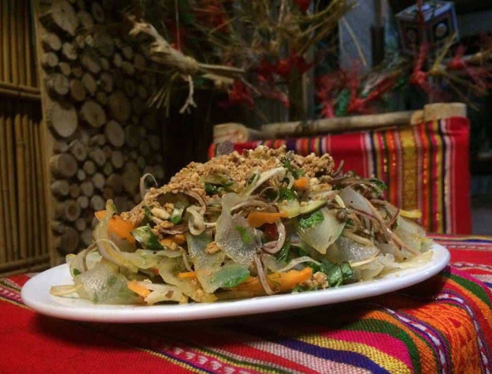 Đây là món ăn nổi tiếng tại Mộc Châu với hương vị tự nhiên của thịt Trâu sẻ nóng, độ tươi ngon của rau củ và đậm vị của các nguyên liệu chế biến. Món nộm da Trâu thường được ăn kèm với bánh đa, bánh tráng hoặc bánh ép để tạo nên cảm giác ngon miệng và độc đáo. Đến Mộc Châu, nhất định phải thử dùng món nộm này khi dùng kèm với rượu cần đặc sản nhé!