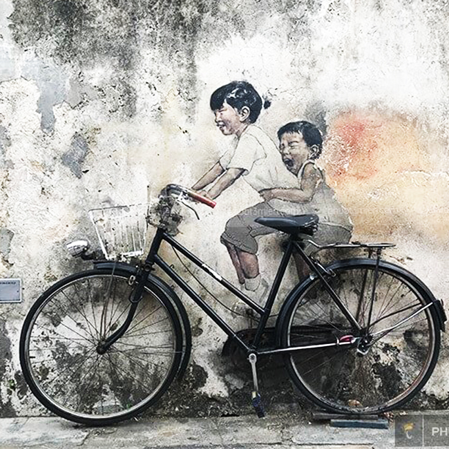 Điểm đặc biệt và nổi bật nhất ở Penang chính là các bức tường nghệ thuật trên đường phố. Những bức tường nghệ thuật kết hợp với các vật thể xung quanh như xe đạp, cây cối, xích đu chắc chắn sẽ cho bạn hàng ngàn bức hình để đời.