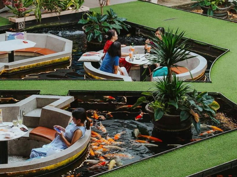Hình dung một buổi chiều hoàng hôn, ánh nắng vàng nhạt chiếu xuống mặt hồ, những chú cá Koi đủ màu sắc tung tăng bơi lội, và bạn cùng người ấy đang nhâm nhi ly cà phê thơm lừng. Cảnh tượng ấy chắc chắn sẽ khiến buổi hẹn hò của bạn trở nên thật lãng mạn. Không chỉ có không gian độc đáo, King Koi Coffee còn phục vụ nhiều món ăn nhẹ hấp dẫn, rất phù hợp để bạn thưởng thức cùng người ấy.