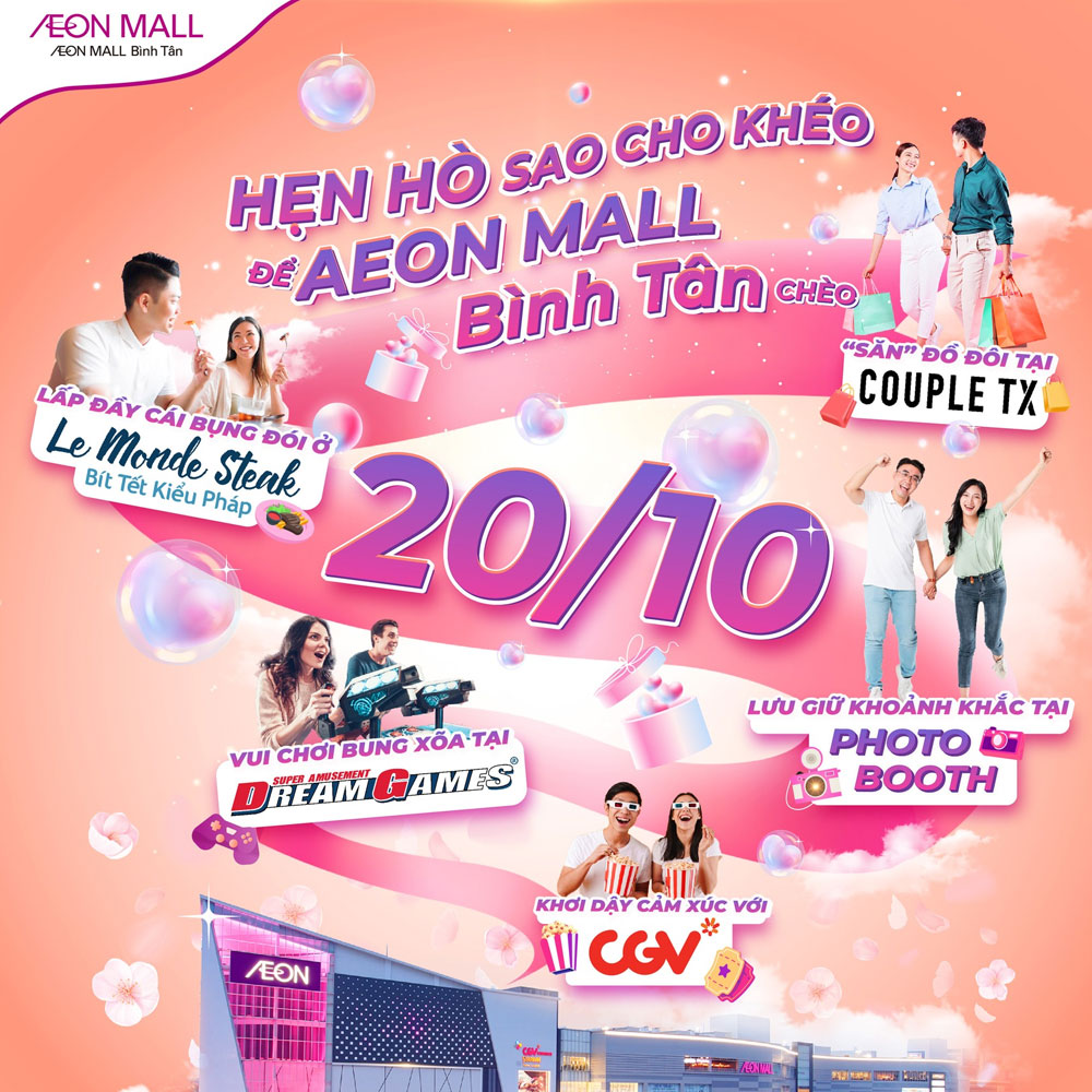 AEON Mall là nơi cung cấp đa dạng dịch vụ từ ẩm thực, mua sắm, khu vui chơi,... rất thích hợp để các cặp đôi có những trải nghiệm thú vị cùng nhau. Ngoài ra, các cặp đôi cũng có thể cùng nhau xem những bộ phim mới ra mắt tại rạp chiếu phim trong trung tâm thương mại để tạo nên những khoảnh khắc thư giãn vui vẻ. Đôi khi chỉ cần nắm tay đi dạo một vòng trung tâm để tham quan và trò chuyện, sau đó ghé vào một quán nước để thưởng thức cũng đủ để cảm nhận được sự ngọt ngào từ nhau.