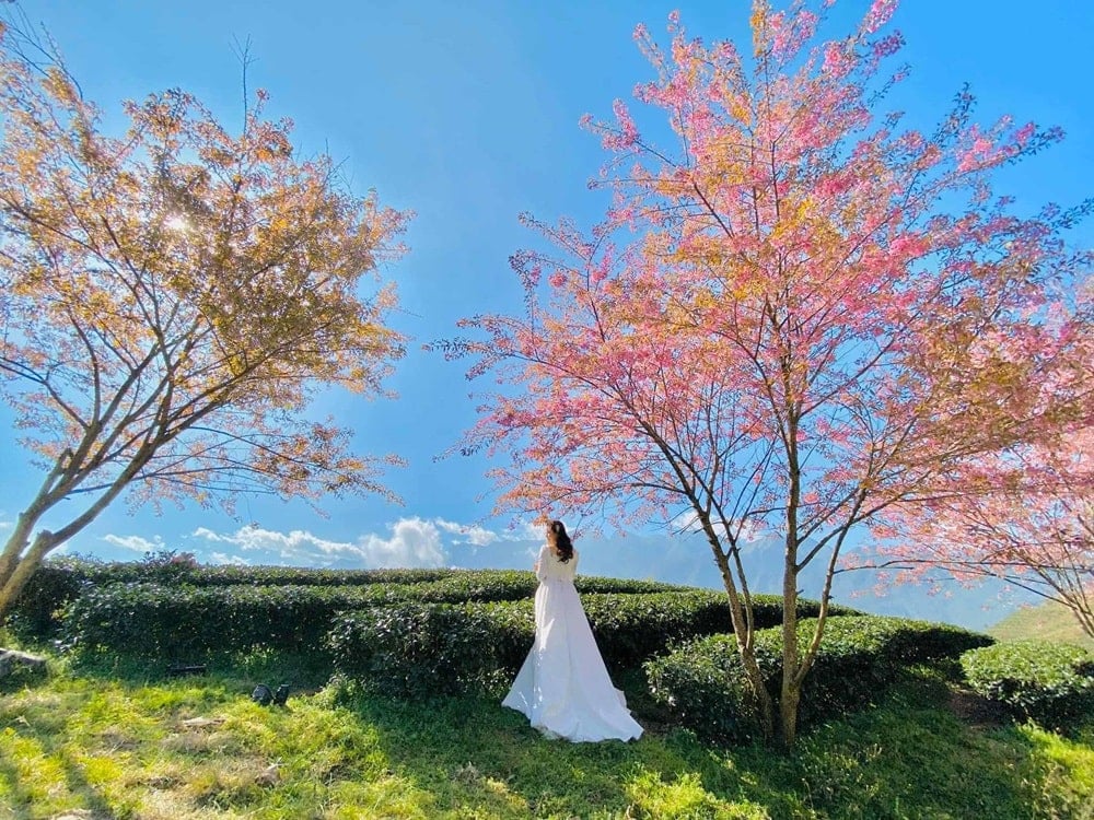 Đến đồi chè Ô Long vào dịp cuối đông, từ tháng 12 đến tháng 1, bạn sẽ được chiêm ngưỡng sắc hồng dịu dàng của những hàng mai anh đào khoe sắc rực rỡ. Những cánh hoa mong manh điểm tô thêm vẻ đẹp thơ mộng, biến nơi đây thành một khung cảnh tựa như cổ tích.