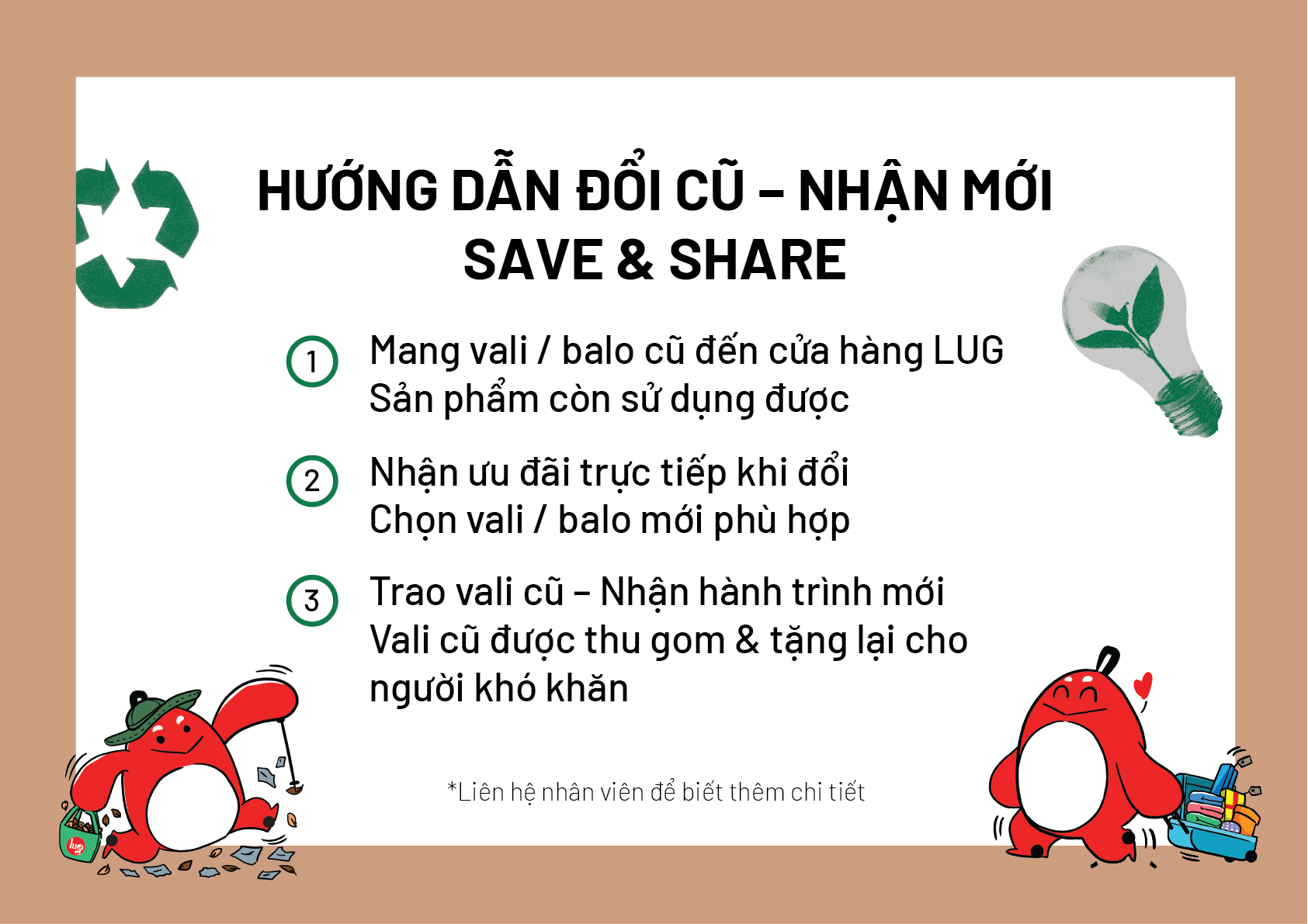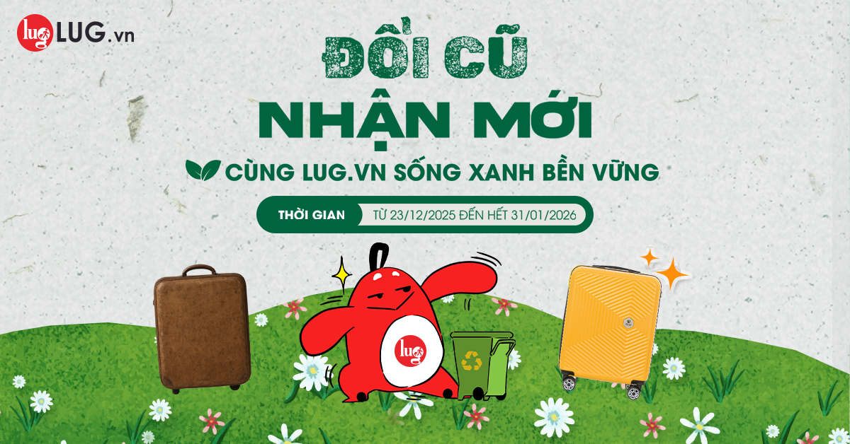 Trong tháng 01/2026, LUG triển khai chương trình khuyến mãi “Đổi Cũ Nhận Mới”, khách hàng chỉ cần mang vali cũ đến cửa hàng sẽ nhận được voucher mua sắm lên đến 300.000 đồng khi chọn mua các mẫu vali nằm trong chương trình ưu đãi.