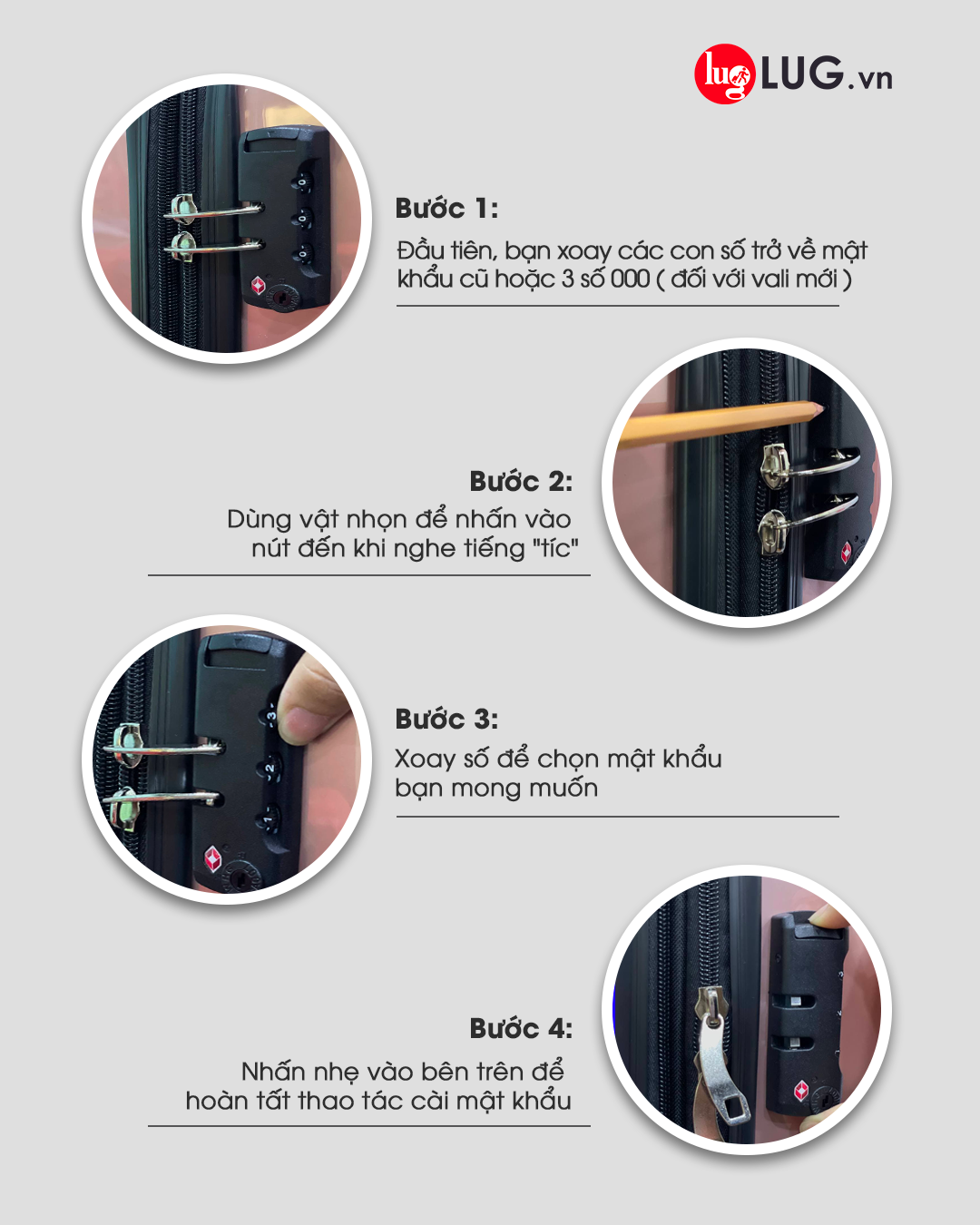 Trên đây là hướng dẫn cách đổi mật khẩu vali đơn giản tại nhà mà bạn có thể áp dụng ngay. Việc thay đổi mật khẩu vali giúp tăng cường tính bảo mật cho đồ dùng cá nhân của bạn khi đi du lịch hay công tác. Lưu ý nên đặt mật khẩu dễ nhớ nhưng cũng đủ phức tạp để bảo vệ tài sản bên trong vali của bạn. Chúc bạn có những chuyến hành trình trọn vẹn cùng vali LUG.vn!