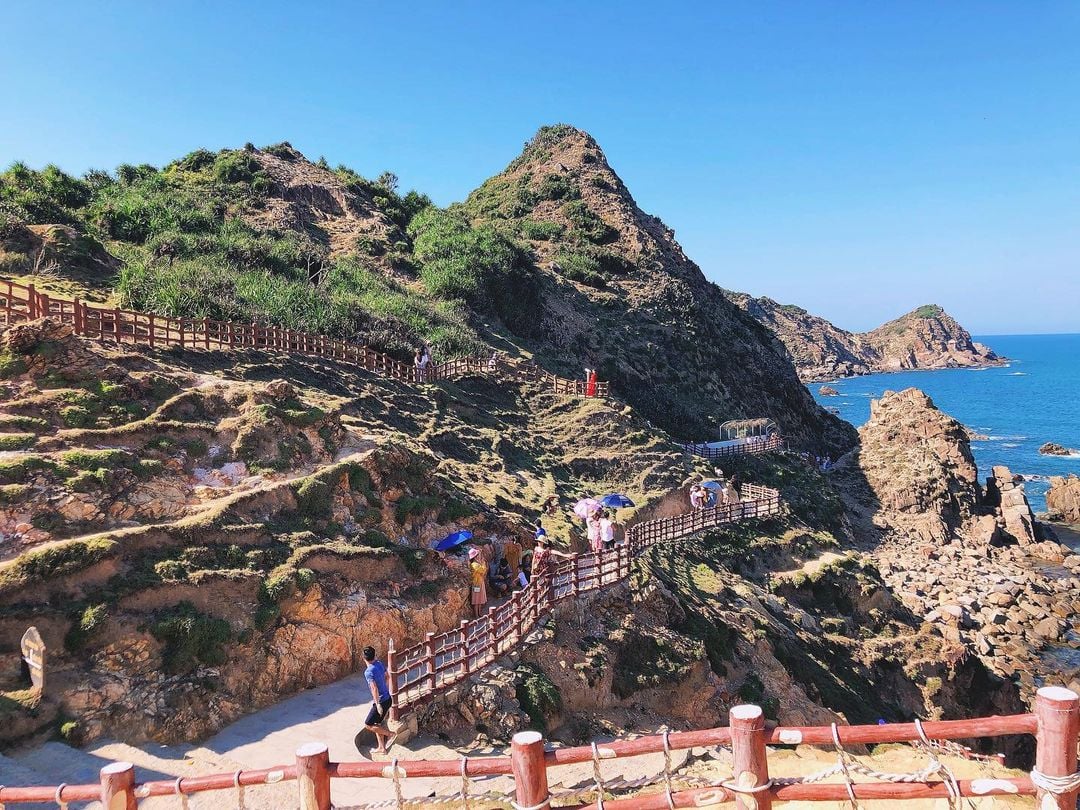 Eo Gió Quy Nhơn nổi bật với con đường đi bộ tuyệt đẹp chạy men theo sườn núi, được sơn màu đỏ gạch và trắng. Đây cũng chính là "phông nền" hoàn hảo cho những bức ảnh check-in, mà bất kỳ du khách nào đến Eo Gió đều không thể bỏ qua.