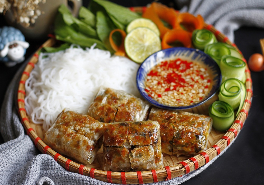 Sau buổi sáng dạo phố, bữa trưa trong Food tour Hải Phòng 1 ngày bạn có thể thử thưởng thức đặc sản Nem Cua Bể trứ danh tại đây. Khác hẳn nem rán thông thường, nem cua bể Hải Phòng có hình vuông, nhân đầy cua, tôm, miến và thịt. Nem cua bể ăn cùng bún và rau sống rất ngon, chắc bụng.