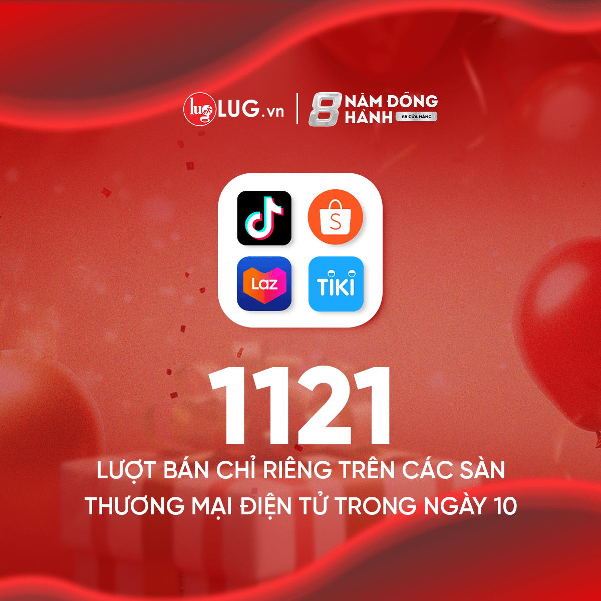 Không hề kém cạnh, các sàn thương mại điện tử của LUG như Shopee, Tiktok shop, Lazada, Tiki cũng bùng nổ đơn hàng với 1121 lượt mua hàng chỉ trong ngày 10.10.