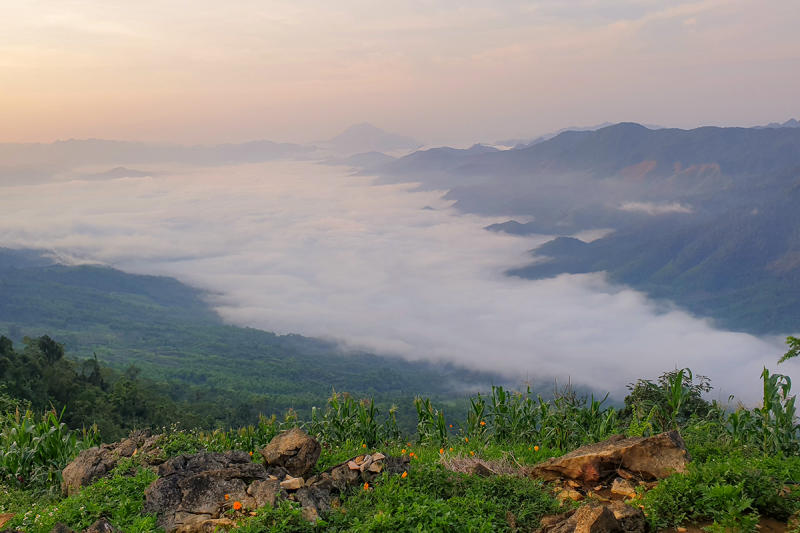 Từ đỉnh săn mây, bạn sẽ được đắm chìm trong cảnh sắc thần tiên với mây trắng bồng bềnh, những thửa ruộng bậc thang xanh tươi và các ngôi nhà nhỏ của người Mông thấp thoáng trong thung lũng. Để bắt được khoảnh khắc tuyệt đẹp này, hãy ghé thăm vào sáng sớm hoặc hoàng hôn.