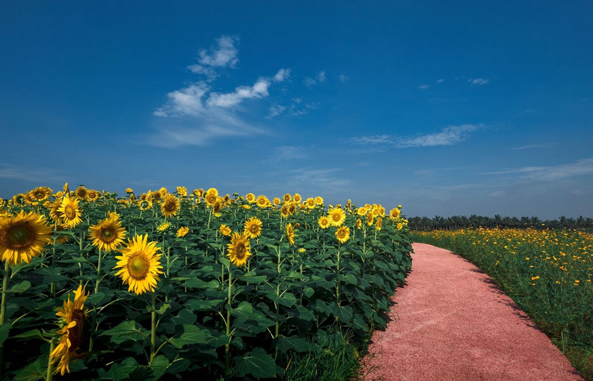 Tại Ecopark Hưng Yên, sẽ có hơn 30 nghìn bông hoa hướng dương nở rộ rực rỡ và toả sáng dưới ánh mặt trời mỗi khi mùa hè đến. Những con đường đất mòn được bao quanh bởi vô vàn bông hoa, cho bạn cảm giác như đang lạc vào một xứ xở thần tiên. Nếu bạn là một người yêu hoa, nơi đây chắc chắn sẽ không để bạn thất vọng.