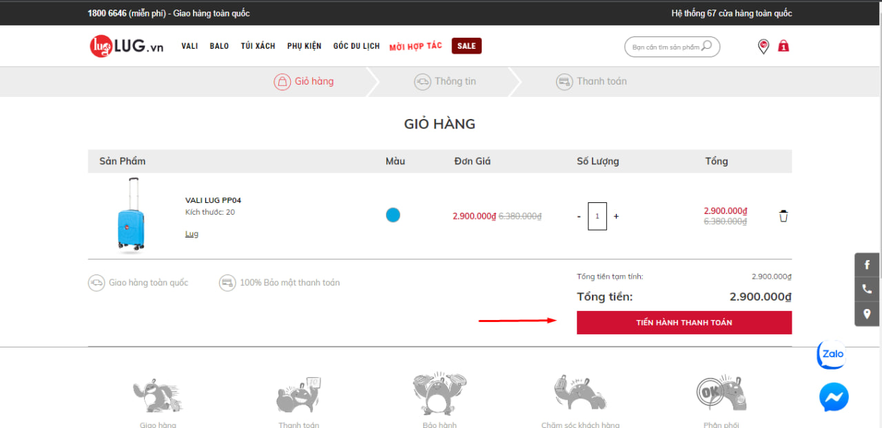 Bước 2: Kiểm tra lại sản phẩm trong giỏ hàng sau đó bấm vào "TIẾN HÀNH THANH TOÁN"