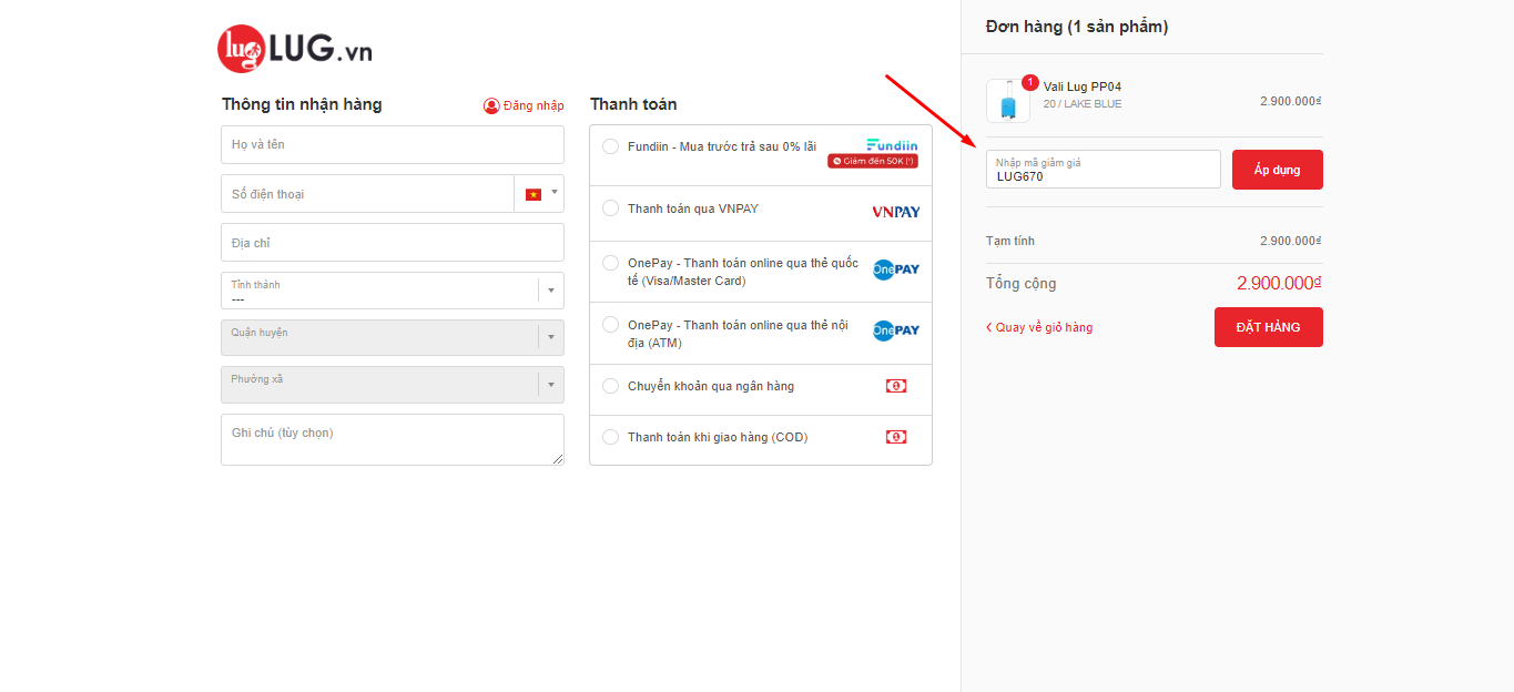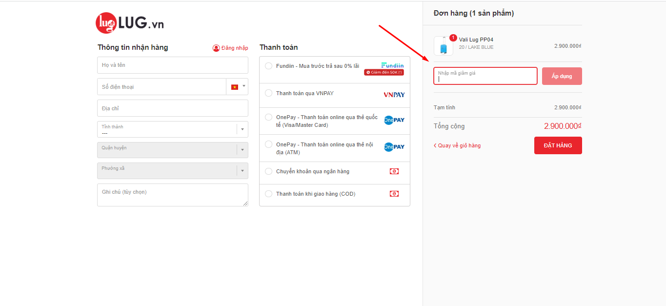 Bước 3: Điền thông tin giao hàng và nhấp vào dòng chữ nhập mã giảm giá