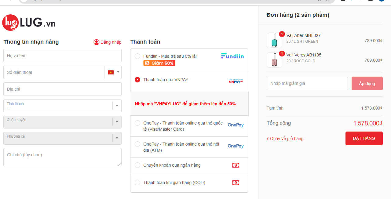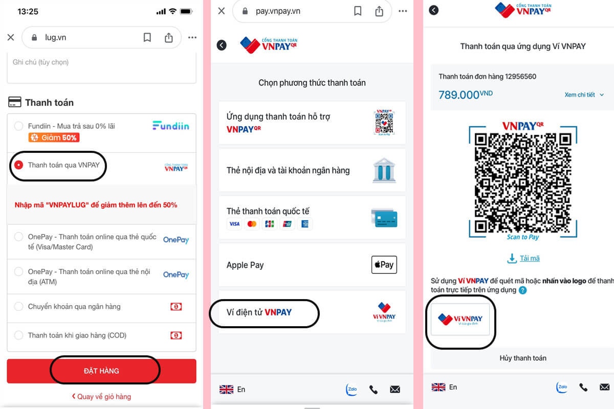 Dùng ví VNPAY thanh toán đơn hàng LUG.vn trên điện thoại
