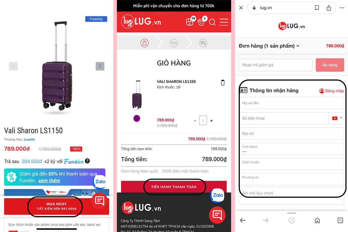 Đối với điện thoại, bạn thực hiện theo trình tự các bước sau để bắt đầu thanh toán đơn hàng mua trên website LUG.vn bằng ví VNPAY: