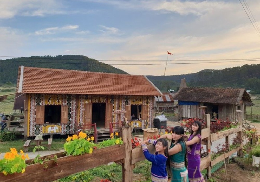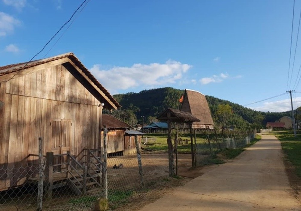 Điểm đặc biệt của làng là không gian sống đậm nét truyền thống với nhà Rông cao vút, nhà sàn cổ kính, những con đường đất đỏ quanh co, hàng rào tre, suối nhỏ len lỏi dưới tán rừng thông xanh biếc. Không gian ở đây quanh năm mát mẻ, sương giăng nhẹ vào mỗi sáng sớm và chiều tối, khiến cả làng như một bức tranh mờ ảo, yên bình và đầy thơ mộng.