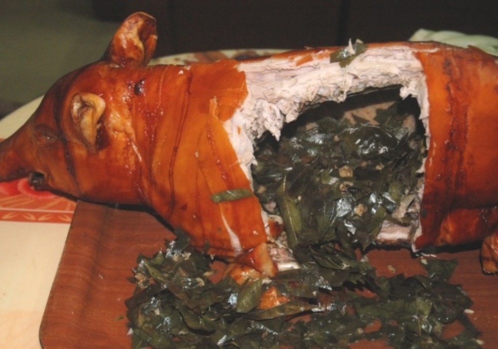 - Lợn quay lá mắc mật với lớp vỏ giòn bì, đậm đà.
