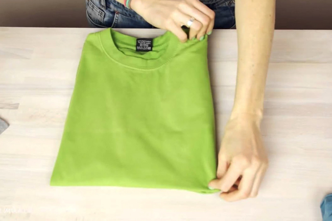 +Bạn hãy trải áo và vuốt phẳng để áo không còn nếp nhăn. Sau đó, gập khoảng 6-8cm đoạn gấu áo lên phía trên và 2 bên ống tay áo vào bên trong thân áo.