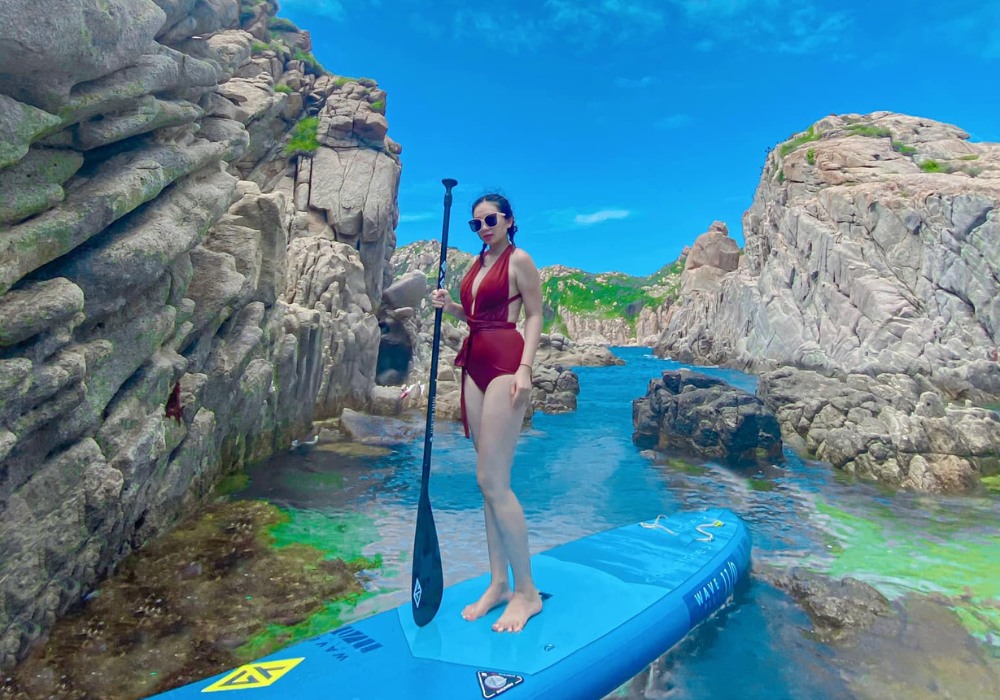 Giữa làn nước trong xanh biếc, trải nghiệm chèo SUP (Stand Up Paddle) cho bạn cảm giác chạm gần hơn đến vẻ đẹp hùng vĩ của mũi Đá Vách Vĩnh Hy. Tận mắt nhìn ngắm và chạm tay vào những vách đá sừng sững vươn mình ra biển lớn. Khi đứng trên chiếc ván giữa mặt nước phẳng lặng, mỗi nhịp chèo đưa bạn lướt nhẹ qua những con sóng nhỏ, phía xa là những khối đá khổng lồ dựng đứng như bức tường thành thiên nhiên khắc họa bởi thời gian.