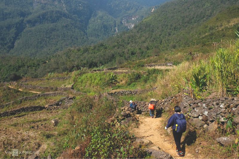 Khi đặt chân đến bản Nhìu Cồ San, hành trình trekking sẽ bắt đầu trên con đường mòn được bao bọc bởi những thửa ruộng bậc thang khô cạn, chỉ còn lại gốc rạ và những hàng rào đá đặc trưng. Rời khỏi bản làng, địa hình trở nên dốc hơn nhưng không quá khó khăn, dẫn bạn sâu dần vào khu rừng.