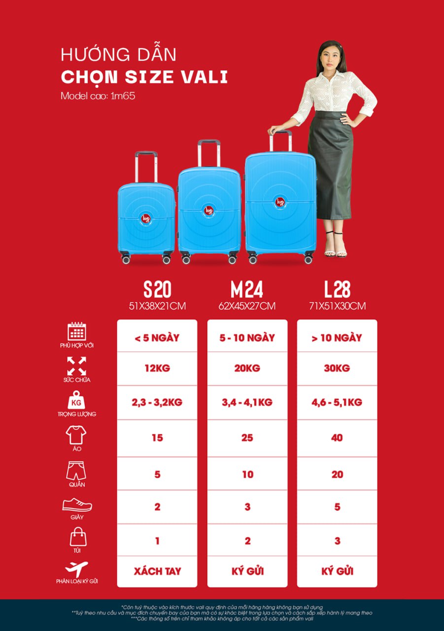 Khách hàng có thể liên hệ với nhân viên bán hàng để được tư vấn mua đúng size vali phù hợp theo nhu cầu sử dụng của bản thân.