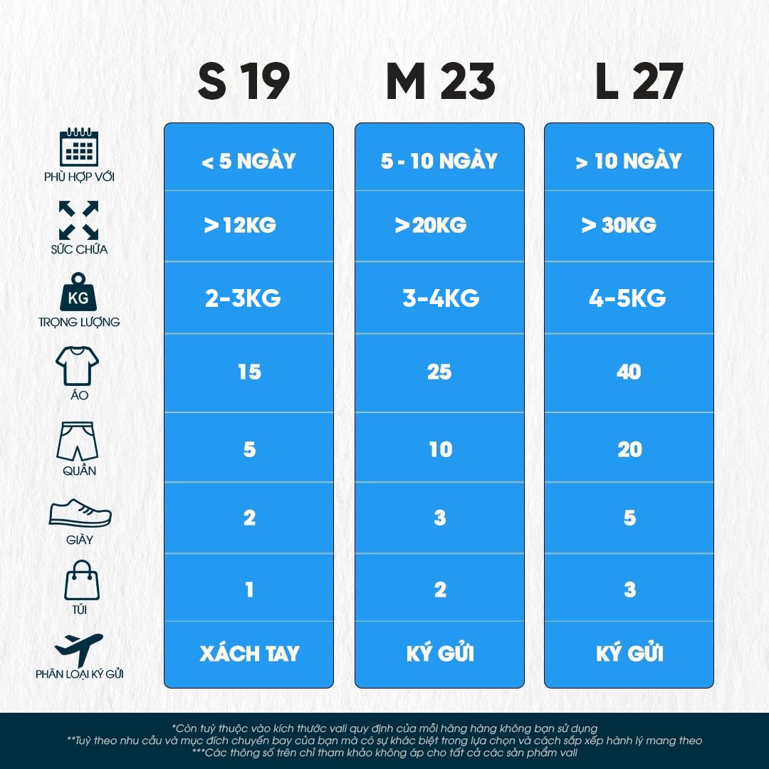 Ngoài 3 size vali cơ bản, khách hàng có thể chọn vali size 22, 23, 26 hoặc 27 đối với những chuyến công tác du lịch dài ngày (3 - 5 ngày), bắt buộc phải ký gửi máy bay.