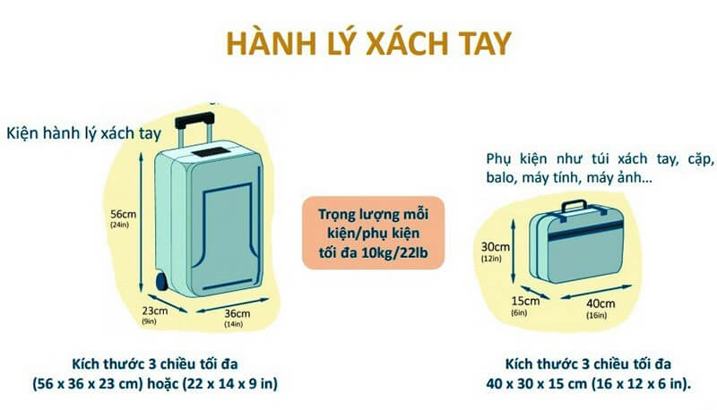 - Hành khách hạng phổ thông: Chỉ được mang 1 kiện hành lý xách tay không quá 7kg và tổng kích thước ba chiều không vượt quá 115cm (tương ứng 56 x 36 x 23 cm hoặc 22 x 14 x 9 inches), cùng một phụ kiện với tổng trọng lượng không vượt quá 12kg (26lb).
