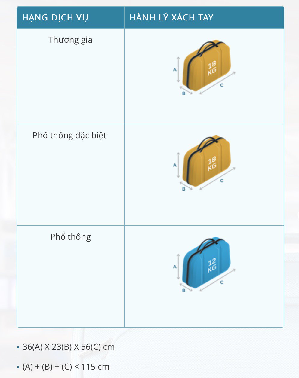 - Tổng kích thước 3 chiều (dài, rộng, cao) của kiện hành lý xách tay không được vượt quá 115cm/45in (56cm x 36cm x 23cm hoặc 22in x 14in x 9in).