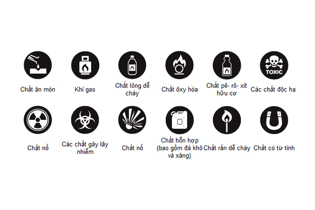 Chất clo, tẩy rửa, oxy hóa, thủy ngân, chất truyền nhiễm độc hại, vật liệu chứa chất phóng xạ vv...