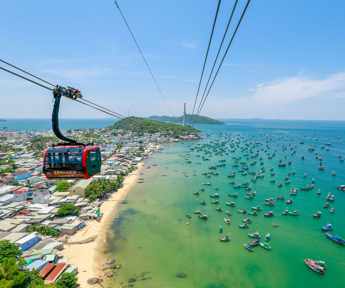 Cáp treo tại Sun World Hòn Thơm có chiều dài hơn hơn 7.899m và được mệnh danh là tuyến đường cáp treo dài nhất thế giới. Du khách ngồi trên cáp treo sẽ được tận hưởng cảnh quan độc đáo của đảo Phú Quốc từ trên cao nhìn xuống.